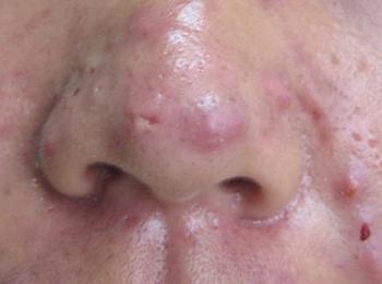 患者杨兰,女,25岁,南昌某公司的员工。于2009年12月15日就诊。患者19岁颜面始出粉刺,未经治疗,至20岁病情加重,颜面布满大小不等结节,挤之有豆渣样物排出,治疗1年余,没有效果。经朋友介绍来到南昌中山皮肤病医院进行治疗。
