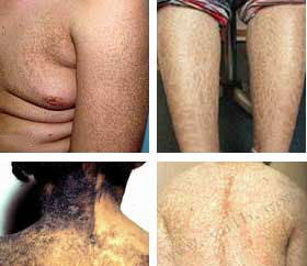 2、性连锁隐性鱼鳞病:可于生后或婴儿发病。皮损鳞屑大而显著,呈黄褐色或污黑色大片鱼鳞状,皮肤干燥粗糙,往往遍布全身,腋窝、及肘窝等部位亦可受累;腹部、背部尤重。如面部受累,则仅限于耳前及颜面侧面。一般不发生毛囊角化。掌趾处皮肤正常,皮损不随年龄增长而减轻,有时反而增重。