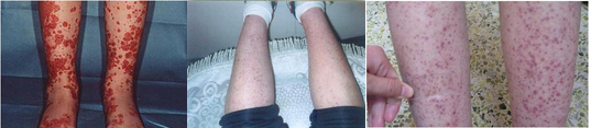 (1)皮肤症状:以下肢大关节附近及臀部分批出现对称分布、大小不等的斑丘疹样紫癜为主,反复发作于四肢臀部,少数累及面和躯干部。皮损初起有皮肤瘙痒,出现小型荨麻疹、血管神经性水肿及多形性红斑。