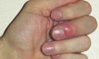 4、自觉症状为疼痛,急性甲沟炎局部搏动性疼痛。慢性甲沟炎甲沟轻度疼