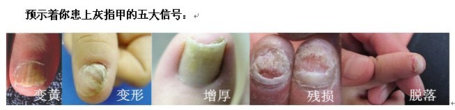 表现症状:张先生由于经常到洗脚店洗脚,感染了脚气,由于没有引起重视疏于治疗,没过多久,又感染上了灰指甲。这几年经过多次芍物治疗,不但没有好转,反而逐渐扩展,手上被传染了8个灰指甲,脚上也被传染了4个趾甲。