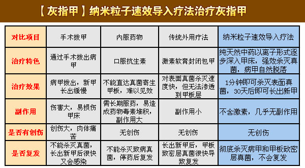 南昌中山皮肤病医院治疗灰指甲采用“等离子渗透软化再生疗”的特色治疗方法,南昌中山皮肤病医院灰指甲诊疗中心采用真菌分类检测设备,准确检测病甲进行科学诊治,运用独特的“等离子渗透软化再生疗”,准确针对各种类型真菌感染的指甲变形、变厚、变白、变黑、 变黄等顽固灰指甲,通过微波辐射多功能治疗结合药离子导入,使得有效杀菌成分可以很轻松地渗入到病甲下,杀灭藏在病甲下的真菌,并促使保养甲床,修复指甲再生,断绝传染源,达到杀菌保养为一体。巩固治疗就可治愈灰指甲,这种治疗方法不仅安全、方便而且不易复发。