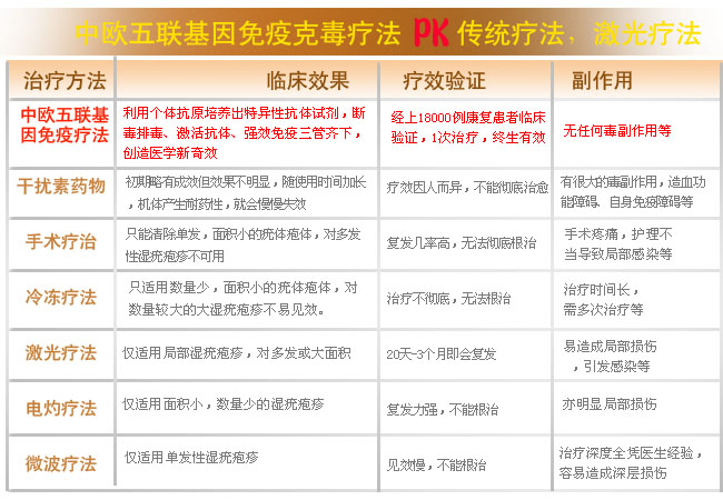 技术优势: 南昌中山皮肤病医院采用的"中欧五联基因免疫克毒疗法",在病毒抗体的持久存活 性上做了重大改善,它注重强化抗体的“ 长效免疫应答”,治疗后,抗体可长达数 十年存活与机体内,比传统手术,激光, 光动力,微波等提纯的抗体存活时间提升 了近百倍。真正达到一次治愈,终生延续 抗体,终生免疫,杜绝复发。