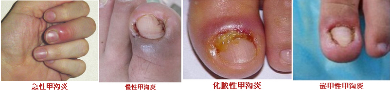 1、急性甲沟炎:初起时甲沟皮肤轻度红 肿、疼痛及压痛。有的局部化脓,由于手足甲沟皮肤角质层较厚,不易自行溃破,致病菌毒力超过机体抵抗力时,可演变为甲周围炎或甲下脓肿,疼痛加剧,甲下可 有黄色脓液聚积,甲板与甲床分离,严重者出现身体不适,伴有发热、寒战、食欲减退、白细胞数增高等症状。