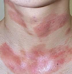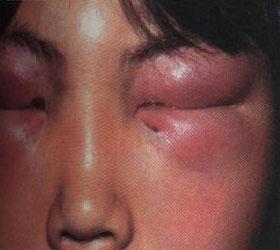 3.皮肤损害通常首先发生在两侧眼皮,两侧上下眼皮变成紫红色,呈实质性水肿,但是眼列大小正常,睁眼不受影响。