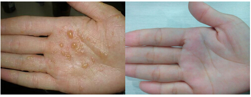 手上长小水泡,突然出现多数群集或散在的位于表皮深处的小疱,呈正常肤色,疱破后流出黏液性液体,数天后水疱吸收、干涸后残留环状鳞屑,自觉瘙痒及烧灼感,如患病时久可引起手掌皮肤干燥、脱屑、增厚。