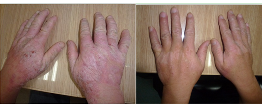 今年53岁的石先生,在年轻的时候曾经做过二十多年的汽车维修工作。自十年前手部出现反复发作的湿疹后,每接触油污,双手瘙痒难忍,痒的时候双手挠个不停,挠完后又开始痛,再接着,手上起了水泡、流水,结痂。去了医院治疗,始终不能治愈。后经熟人介绍,来到南昌中山皮肤医院治疗。接受了我院专家为其安排“3T通调疗法”的治疗一个月左右的时间,石先生手上的湿疹基本康复,不再瘙痒,并开始长出新的皮肤。
