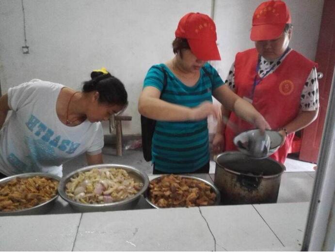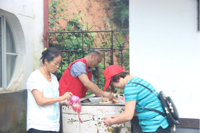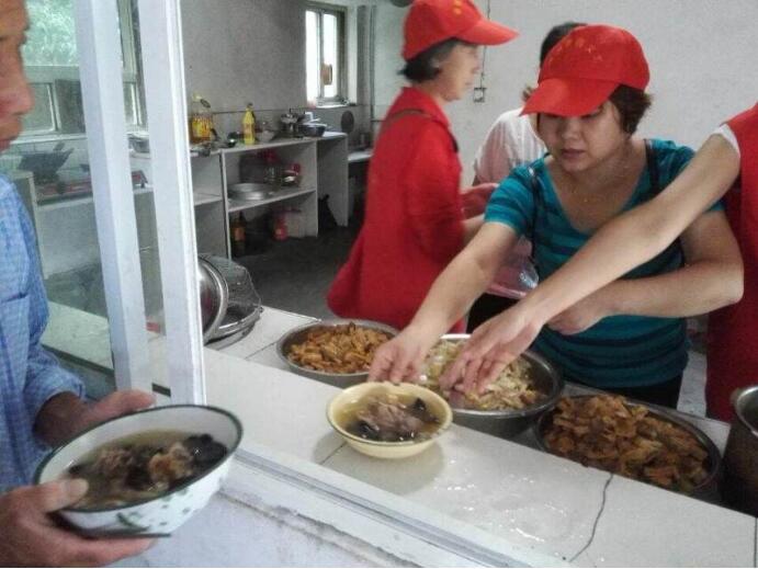 义工和敬老院工作人员共同为老人们准备丰盛的午餐,提前给老人们过一个幸福的中秋团圆节