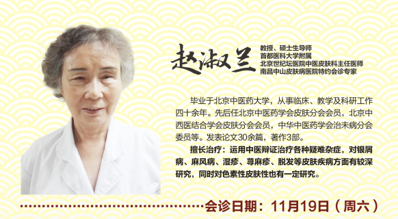 11月19日 首都医科大学附属北京世纪坛医院中医皮肤科主任医师、教授、硕士生导师赵淑兰莅临我院会诊