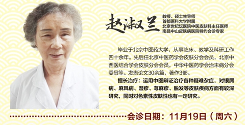 - 上一篇:11月19日 首都医科大学附属北京世纪坛医院中医皮肤科主任医师、教授、硕士生导师赵淑兰莅临我院会诊